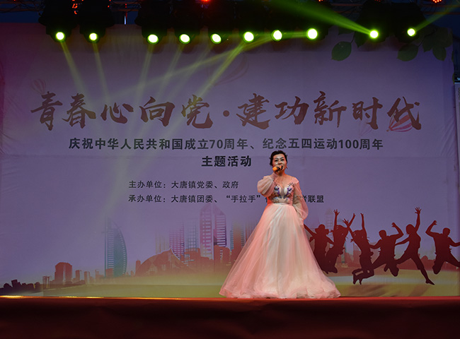 百年传薪火,五四尽芳华;青春心向党,建功新时代。为庆祝中华人民共和国成立70 周年、纪念五四运动100 周年,在五四青年节来临之际,大唐镇举行“青春心向党,建功新时代”庆祝中华人民共和国成立70周年、纪念五四运动100周年主题晚会。大唐镇团委联合镇派出所等事业单位及企业青年代表们,组成了“说、唱、演”青年团给大家上演了一场精彩的演出。